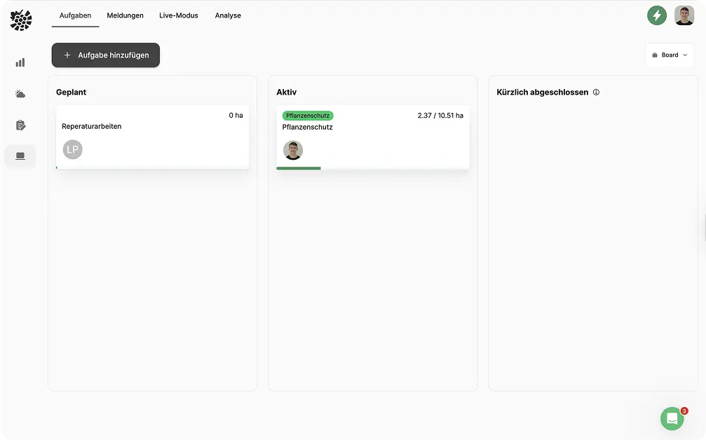 Behalten Sie den Fortschritt im Außenbetrieb in Echtzeit und Fahrspurenaufzeichnung im Blick und sehen Sie, welche Arbeiten bereits erledigt wurden.
